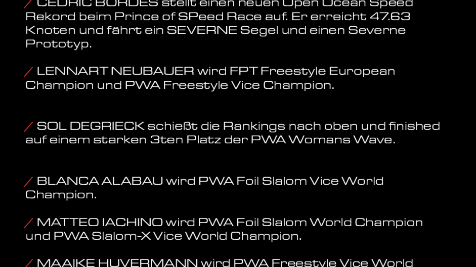 SEVERNE Rider haben auf allerhöchstem Niveau dominiert auf den größten Bühnen des Windsurfens und in den anspruchsvollsten Disziplinen.